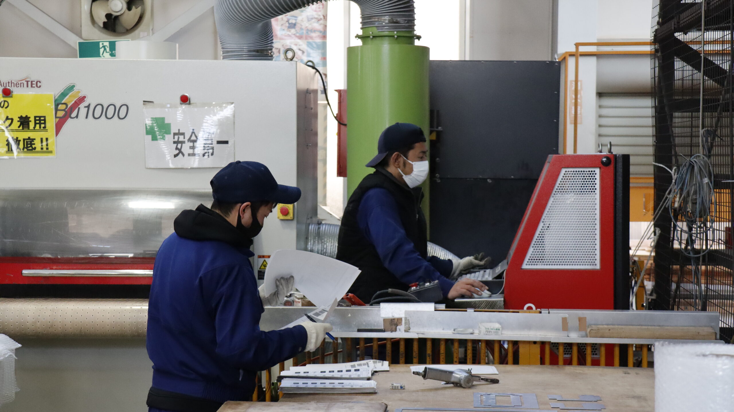 ②板金工程:NCマシンやレーザー加工機といった各種機械を使用して材料の切断や曲げ加工を行います。